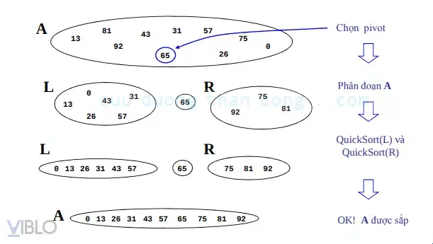 Quick Sort chọn một phần tử làm “chốt” (pivot) và phân hoạch mảng sao cho các phần tử nhỏ hơn pivot nằm bên trái và các phần tử lớn hơn nằm bên phải. Sau đó lặp lại đệ quy cho hai nửa.
