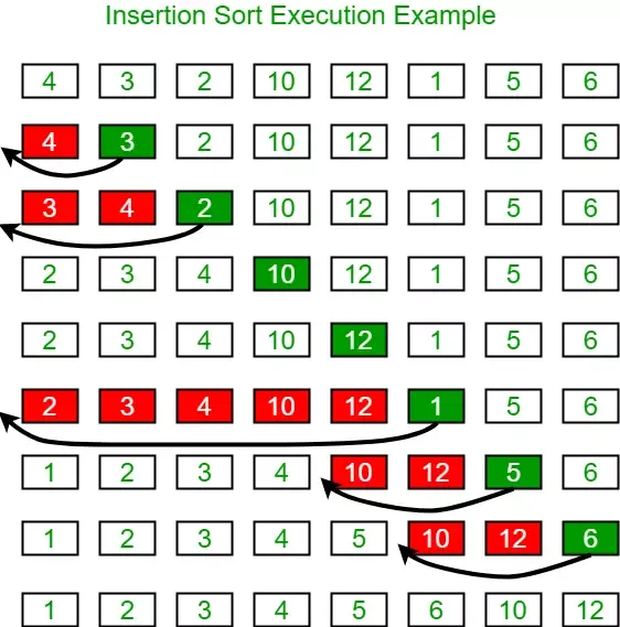 Thuật toán chia mảng thành hai phần: phần đã sắp xếp (bên trái) và phần chưa sắp xếp (bên phải). Duyệt từ phần tử thứ 2, ta so sánh nó với các phần tử bên trái để tìm vị trí đứng đúng.