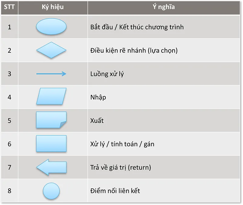 Dưới đây là các ký hiệu cơ bản mà bạn cần ghi nhớ khi thực hiện cách vẽ lưu đồ thuật toán tiêu chuẩn: