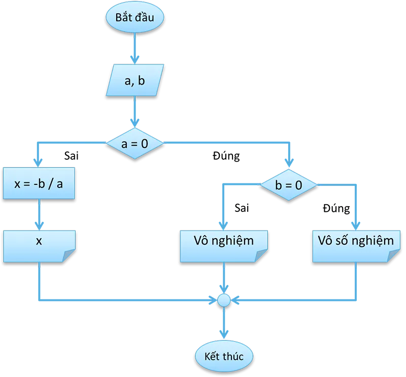 Giải phương trình bậc nhất $ax + b = 0$ yêu cầu một cấu trúc điều khiển lồng nhau phức tạp hơn để xử lý tất cả các trường hợp đặc biệt (Edge Cases). Khi áp dụng cách vẽ lưu đồ thuật toán cho bài này, bạn phải xét đến trường hợp $a = 0$ để tránh lỗi chia cho số không (division by zero).