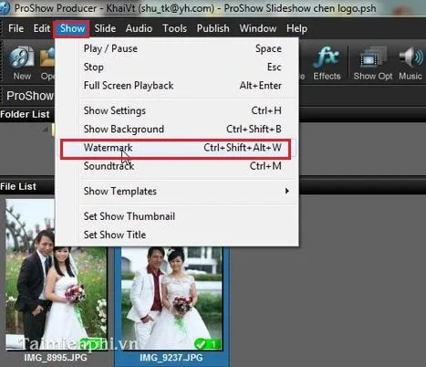 Bước 2: Để bắt đầu chèn logo, bạn tìm trên thanh công cụ mục Show, sau đó nhấp vào dòng Watermark. Một cách nhanh hơn là sử dụng tổ hợp phím tắt Ctrl+Shift+Alt+W.