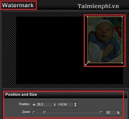 Bước 5: Tùy chỉnh kích thước và vị trí. Tại bảng Position and Size, bạn có thể dùng chuột kéo thả trực tiếp logo trên màn hình xem trước hoặc điều chỉnh các thông số Position (Vị trí) và Zoom (Phóng to/thu nhỏ) để đạt được độ chuẩn xác cao nhất.