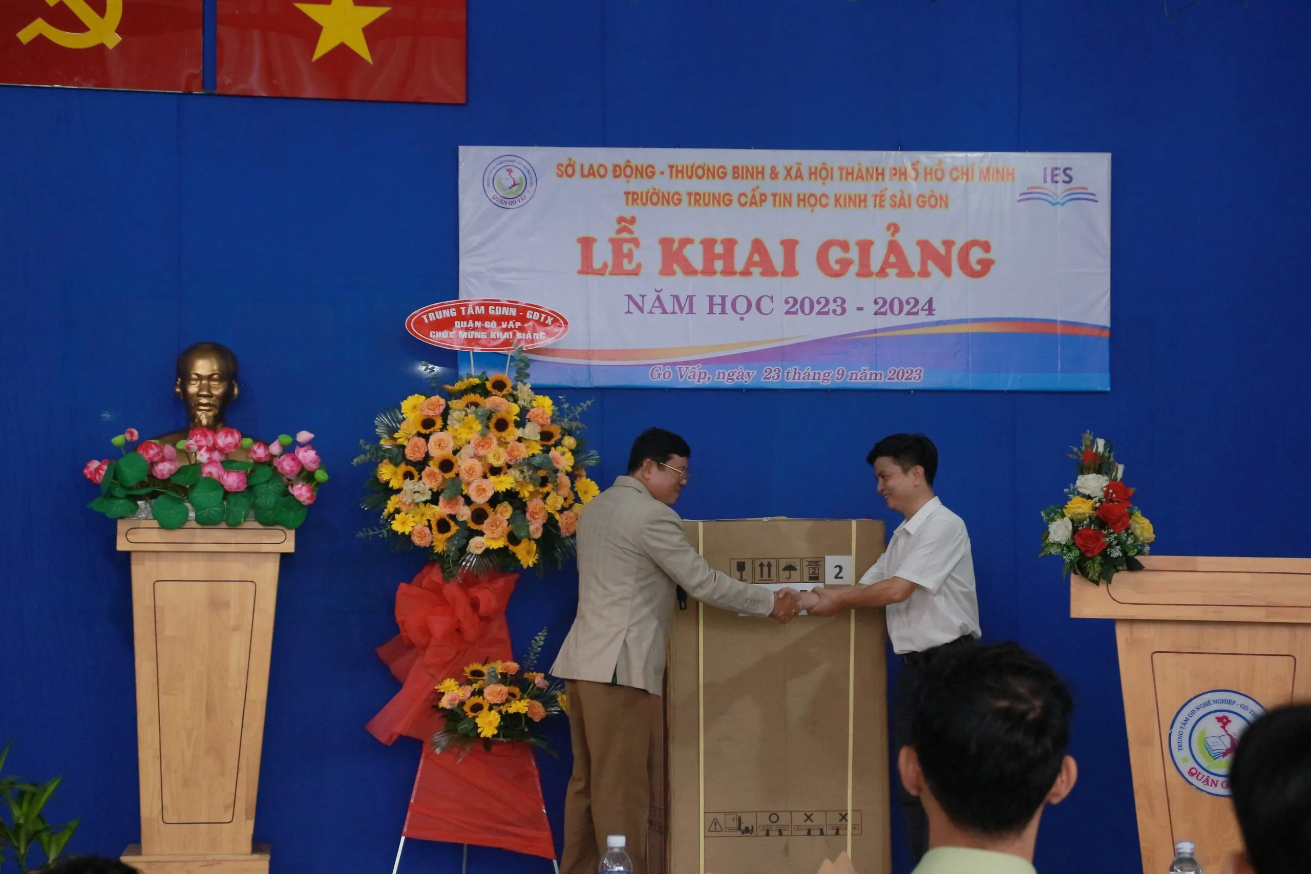 Đại diện học sinh khóa K22 trao hoa cảm ơn ban lãnh đạo hai đơn vị đã tạo điều kiện học tập thuận lợi. Thầy Nguyễn Quang Huy thay mặt trường trung cấp tin học kinh tế sài gòn trao quà hỗ trợ in ấn cho Trung tâm GDNN-GDTX Gò Vấp, thể hiện tinh thần hợp tác lâu dài.